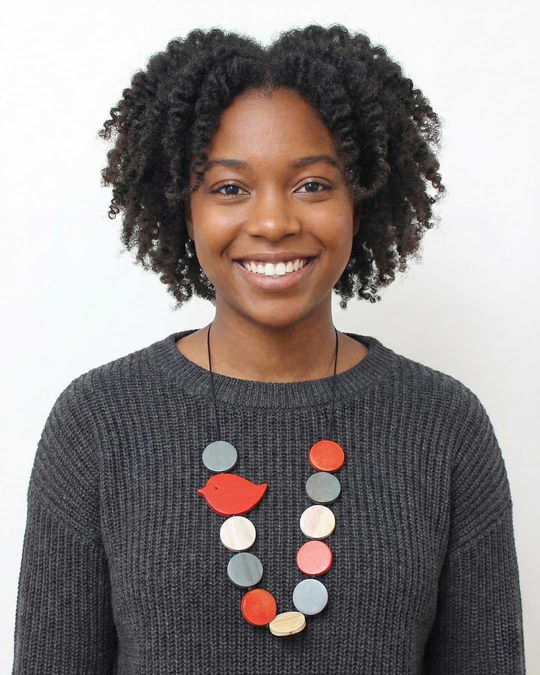 A sweet robin takes center stage in this playful yet earthy piece, where hand-dyed wood beads in warm red, soft grey, and natural beige form a rhythmic, easygoing statement. Lightweight and adjustable, it’s the kind of necklace that brightens up your outfit—and your day.
