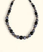 • Design: Alternating matte black and hand-painted ceramic beads form a bold pattern. Ceramic beads are adorned with intricate blue and white geometric designs, complemented by textured and smooth silver-tone metal accents.