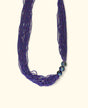 Design: Multiple strands of fine purple-blue glass beads cascade in a layered and textured arrangement. The centerpiece features three 17mm round, hand-painted ceramic beads with intricate floral and abstract patterns in tones of green, light blue, and indigo.