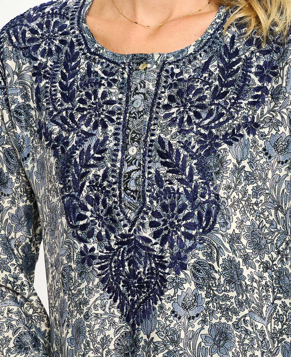 Surround yourself with the deep hues of blue that emulate the drama of the midnight forest. With soft fabric, these tunic tops feel easy on the skin and are soothing to the eyes. Featuring beautiful embroidery on the neckline, bottom hem, and back.