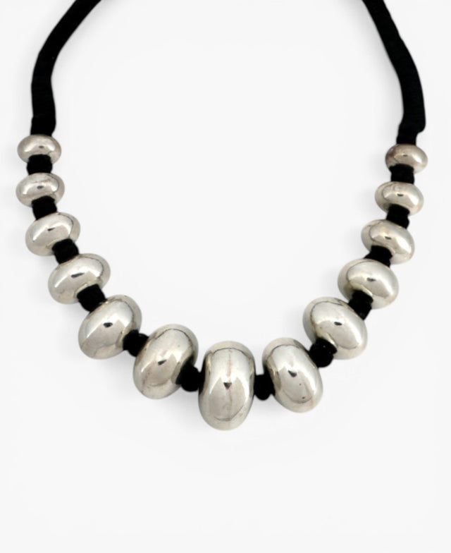 Strung on a cotton cord, this choker-style necklace features large metal beads in graduating sizes, presenting an antique silver color that adds an air of timeless elegance. The 20-inch necklace balances statement-making appeal with classic aesthetics.