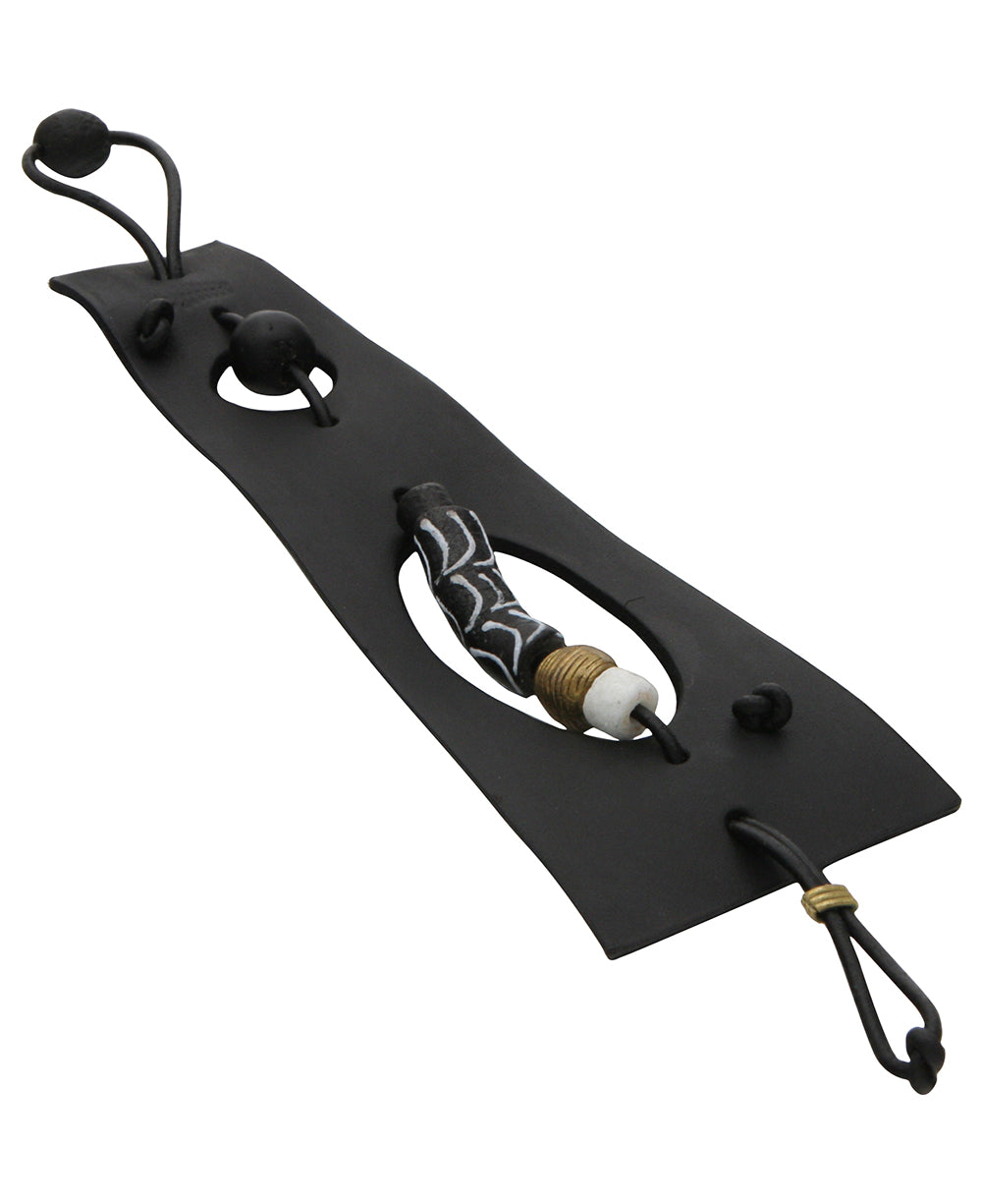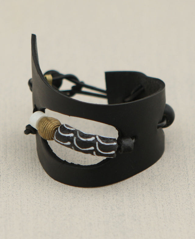 Designed for both men and women, this leather bracelet is crafted in Ghana with just the right amount of embellishment. Featuring a wide leather strap, the bracelet features geometric cutouts and is strung with traditional African beads for texture. Made with a button and loop closure. The bracelet is 9 inches long in total. The leather strap is 6 inches long and 2 inches wide. Fairtrade.